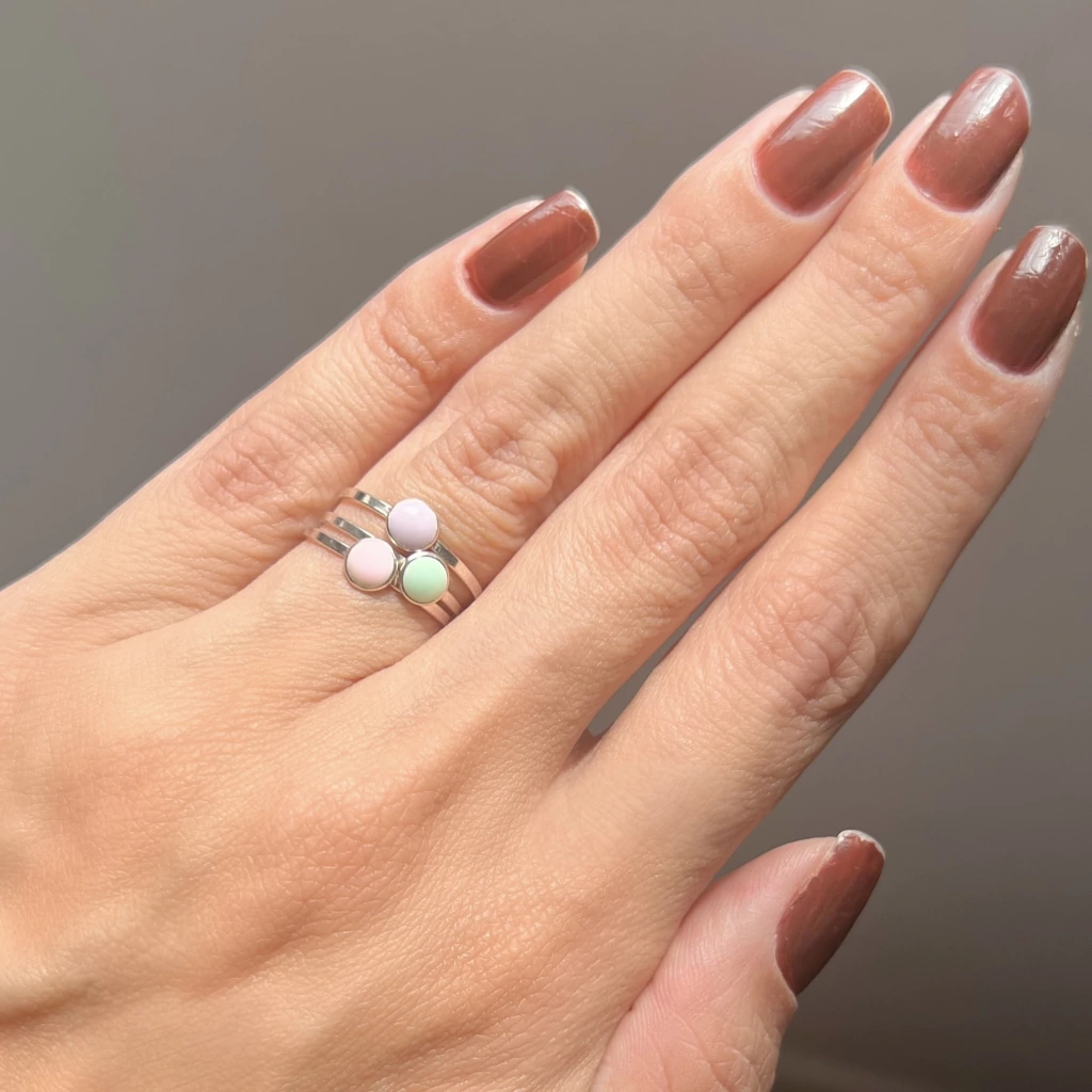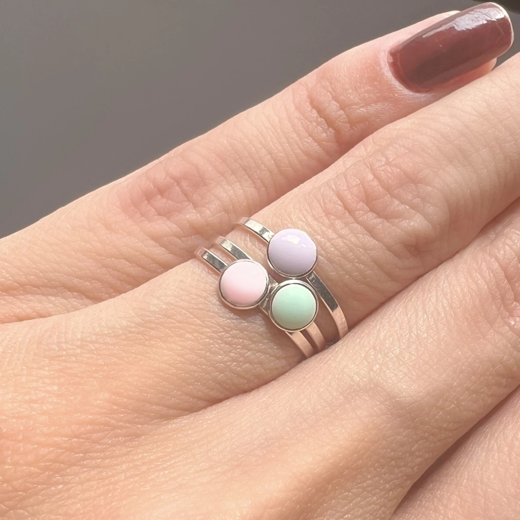 Doce como as Cores da Vida. Feitas com prata 925 e resina em tons candy, estas alianças trazem consigo a alegria e a suavidade das cores candy. Escolha a sua combinação favorita e adicione um toque de doçura ao seu estilo.