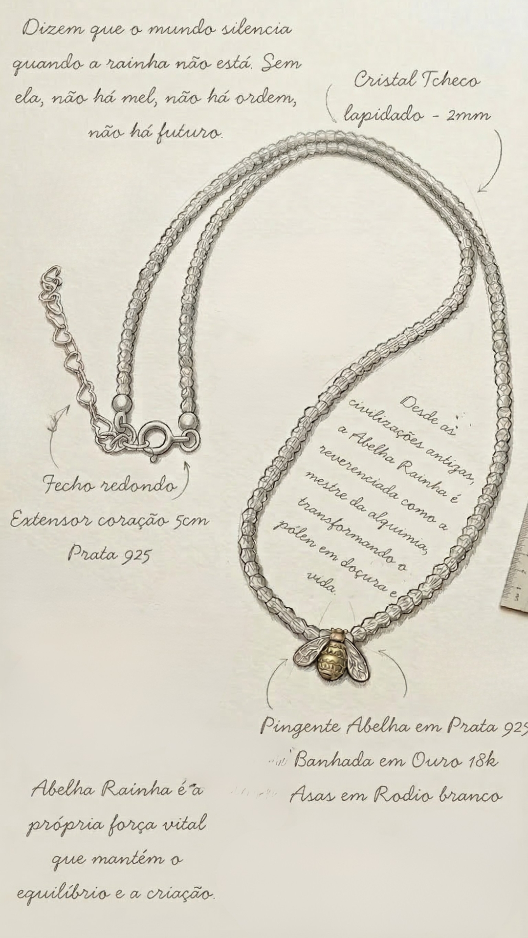 O grande protagonista é o pendente de abelha, símbolo de prosperidade e determinação, abelha em Prata 925, banhada em ouro 18k. Suas asas, trabalhadas com o requinte do ródio branco, trazem um contraste moderno e luxuoso.
