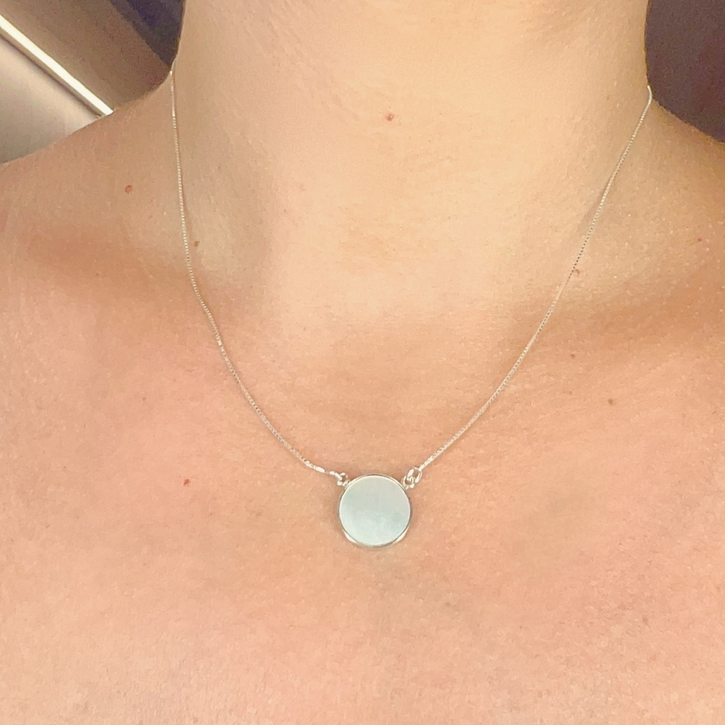 Este colar elegante vem com um pingente de madrepérola delicadamente envolto em prata. A madrepérola adiciona um toque de brilho cintilante, enquanto a prata realça a beleza natural da gema. Uma combinação sofisticada de materiais que resulta em um brinco encantador e versátil para complementar seu estilo com elegância